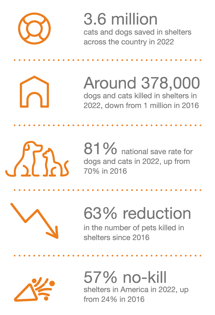 Since 2016, when Chief Executive Officer Julie Castle announced our goal to bring the nation to no-kill by 2025, we have been tracking the lifesaving progress that your gifts make possible. This is what you have helped achieve for our nation’s homeless pets: